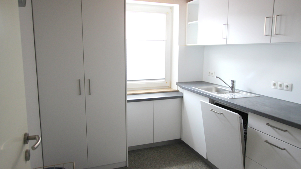 - Küche mit Kühlschrank, Mikrowelle und Kaffeemaschine