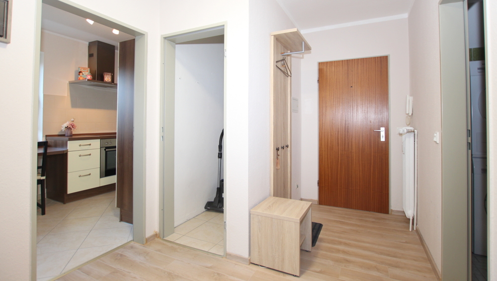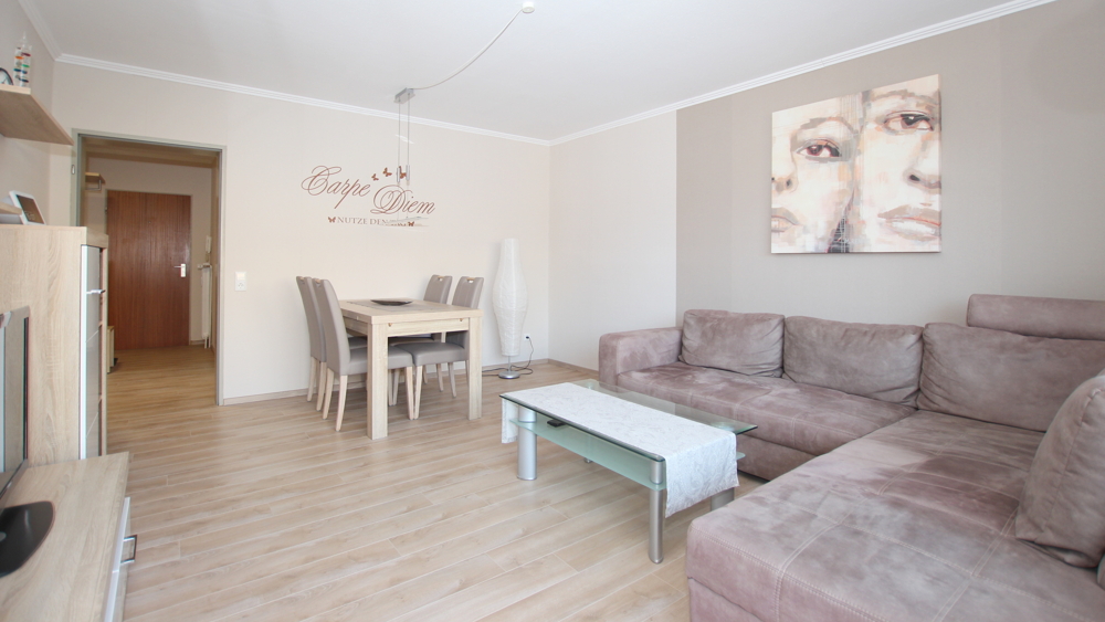 - Fußböden im Flur, Wohn- und Schlafzimmer mit Laminat (helle Eichenoptik) versehen