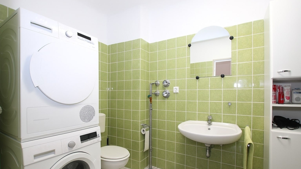 - Badezimmer ausgestattet mit bodenstehendem WC, Duschbadewanne und Waschbecken (Sanitärobjekte weiß); Waschmaschinen und Trockneranschluss vorhanden; Wände ¾ hoch gefliest (grün), Boden gefliest (grau/weiß)
