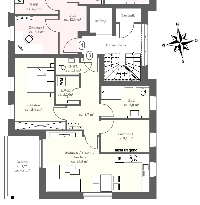 Jede Einheit verfügt über eine eigene Terrasse bzw. einen Balkon, während die Dachgeschosswohnung gleich zwei Balkone bietet. Das Haus wird barrierefrei errichtet. Ein Aufzug verbindet alle Etagen und ermöglicht einen komfortablen Zugang zu jeder Einheit.