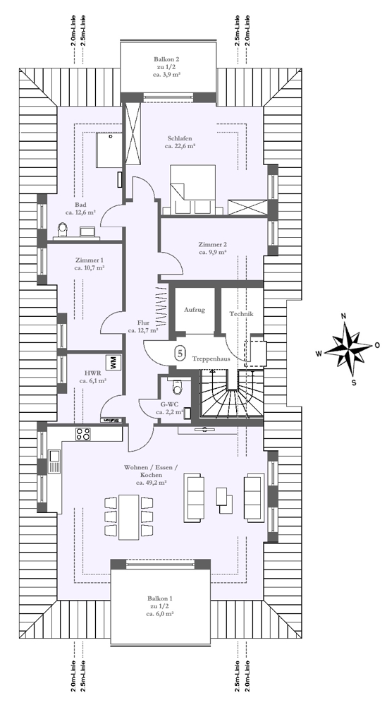 Jede Einheit verfügt über eine eigene Terrasse bzw. einen Balkon, während die Dachgeschosswohnung gleich zwei Balkone bietet. Das Haus wird barrierefrei errichtet. Ein Aufzug verbindet alle Etagen und ermöglicht einen komfortablen Zugang zu jeder Einheit.