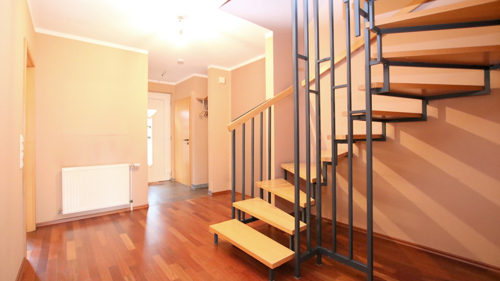 Beschreibung Im Erdgeschoss finden Sie ein sonniges Wohn- und Esszimmer mit Zugang zur Südwest-Terrasse, Wohnküche (die vorhandene EBK kann vom Vormieter übernommen werden), Hauswirtschaftsraum, Gäste-WC und Eingangsdiele. Das Obergeschoss teilt sich auf in 3 Schlafzimmer, Badezimmer, Heizungsraum und Flur. Für Gartengeräte und Fahrräder stehen 2 kleine Abstellräume zur Verfügung. Weiterhin gehört ein Carportstellplatz (mtl. 40,- €) zum Mietangebot.