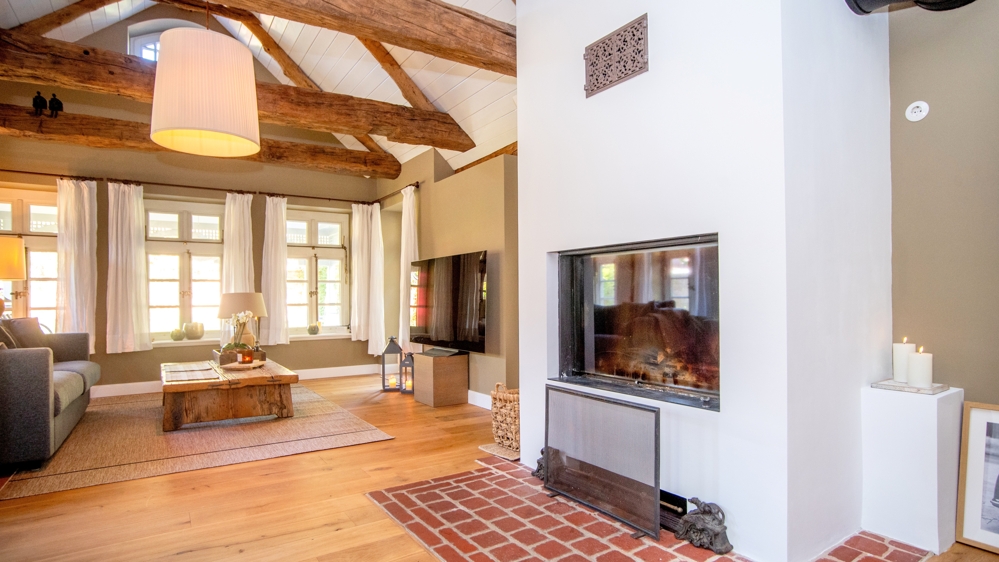 - Wohnbereich bis in den Giebel offen gestaltet; gemauerter und weiß verputzter Kamin mit Feuerschutzverglasung; Zugang zum Garten-/Terrassenbereich vorhanden