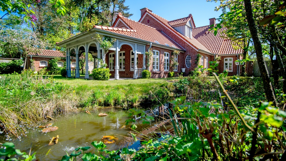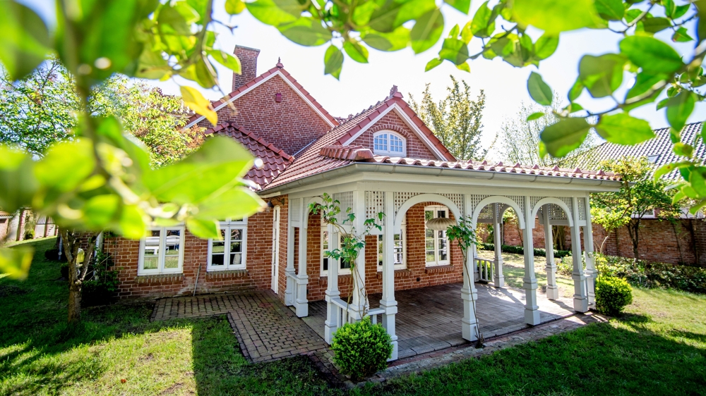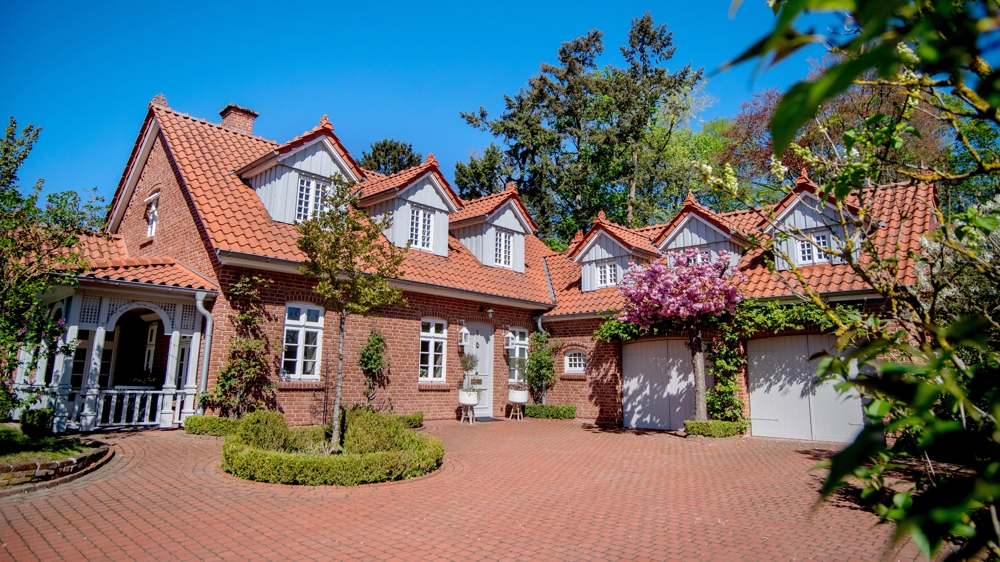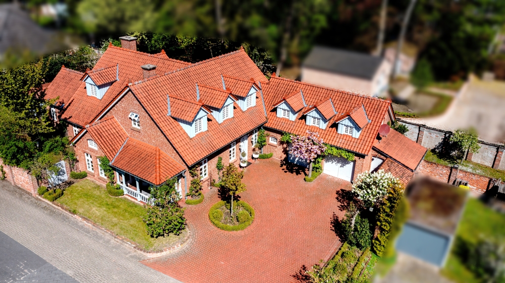 Beschreibung Dieses außergewöhnliche Anwesen vereint auf eine sehr ansprechende und ästhetische Art diverse Stilrichtungen - die Bauweise in Verbindung mit der Gartengestaltung erinnert mit ihren vielen Giebeln und pittoresken Sprossenfenstern an ein malerisches, englisches Cottage, während sich im Inneren des Hauses viele typisch norddeutsche, historische Elemente wie Eichenholz-Parkett und massives Ständerwerk, stilvolle Kassettentüren mit Ornamentverglasung sowie Speckstein-Ofen und gemauerter Kamin mit einem modernen Einrichtungsstil gekonnt vermischen. Die an den Wohnbereich angrenzende Veranda ähnelt wiederum dem geschmackvollen, besonders schönen Stil der bekannten amerikanischen Südstaatenhäuser und fügt sich ansprechend und einladend in das Ensemble ein. Eine massiv errichtete Doppelgarage mit Fahrrad-Geräteraum sowie ein Nebengebäude mit Werkstatt und Abstellraum sind zwei von vielen weiteren Extras.