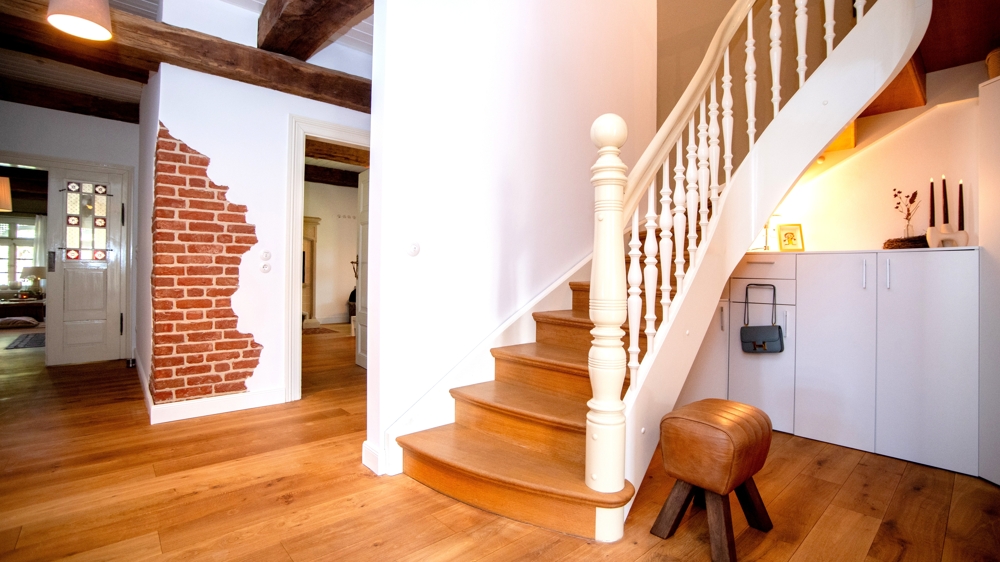 - Diele mit offener Massivholztreppe bestehend aus Trittstufen in Naturoptik und kunstvoll gedrechselten Streben im Massivholz-Geländer (weiß); hochwertige Einbauschränke (weiß) im Treppenbereich