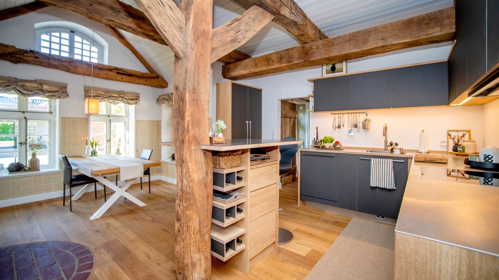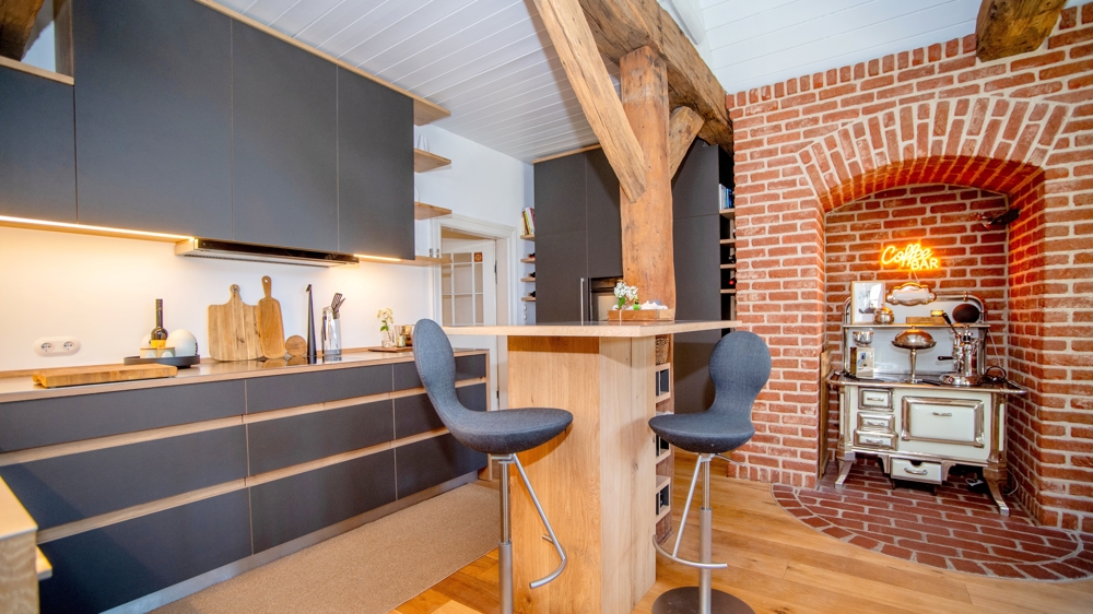 - großzügige Küche mit neuer, hochwertiger Einbauküche von Garrelts design, ausgestattet mit Induktionskochfeld, Umluft-Dunstabzugshaube (Berbel), Backofen, Kühlschrank und Quooker-Wasserhahn; Küchenfronten in anthrazit matt; Massivholz-Arbeitsfläche; Frühstückstresen mit Stromanschluss; antiker und funktionstüchtiger Stangenofen in einer Nische installiert; Zugang zur überdachten Südost-Terrasse