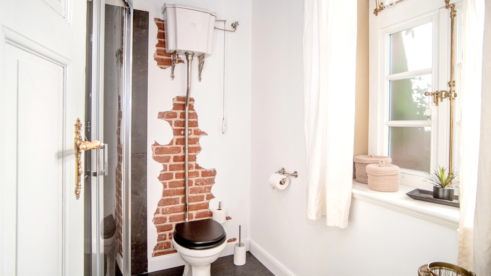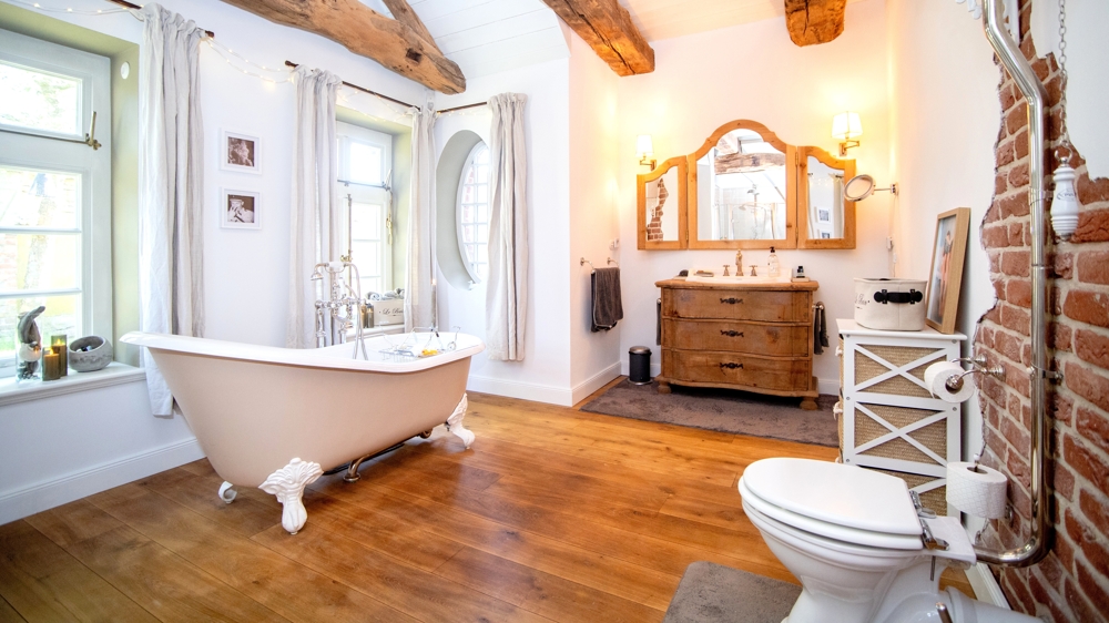 - lichtdurchflutetes Bad ausgestattet mit freistehender Badewanne, bodengleicher Dusche mit Duschabtrennung aus Glas, Stand-WC mit hoch hängendem Spülkasten in historischem Stil sowie mit einem Waschtisch (Sanitärobjekte weiß); Boden mit Eichenparkett versehen