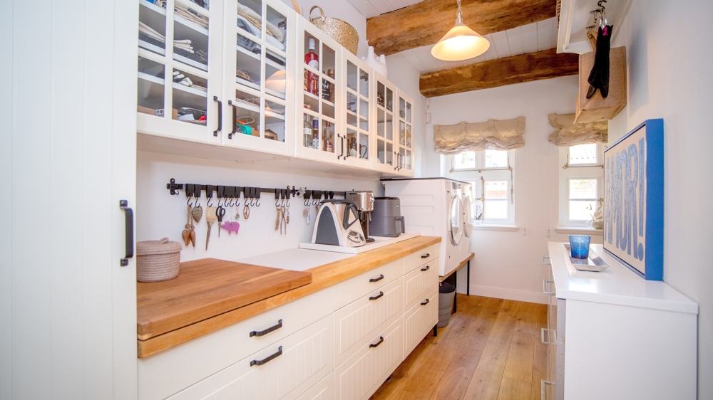 - Hauswirtschaftsraum mit Waschmaschinen- und Trockneranschluss; diverse Einbauschränke in Massivholzausführung in ansprechendem Landhausstil (weiß), Waschbecken installiert; Zugang zur Garage und zum rückwärtigen Außenbereich