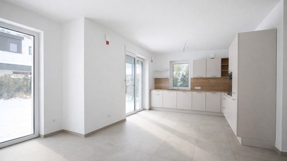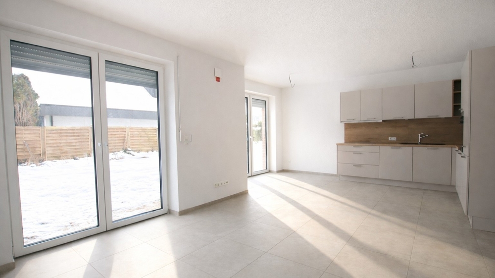 Beschreibung In zentraler, ruhiger Lage entstehen zwei moderne Mehrfamilienhäuser mit jeweils drei Wohneinheiten. Die durchdachte Architektur bietet höchsten Wohnkomfort und Privatsphäre - jede Wohnung hat einen separaten Eingang. Die zwei zur Vermietung stehenden Erdgeschosswohnungen bestehen aus je zwei Zimmern, einer offenen Küche, Badezimmer, Abstellraum sowie Flur. Zusätzlich verfügen die Wohnungen über eine überdachte Terrasse und einen eigenen Gartenanteil. Jeder Wohnung ist ein Stellplatz zugeordnet. Im gemeinschaftlichen Schuppen können Fahrräder bequem abgestellt werden. Das Neubauprojekt wird nach den neuesten Standards des Gebäudeenergiegesetzes errichtet. Eine moderne Luft-Wasser-Wärmepumpe sorgt für eine effiziente und umweltfreundliche Beheizung. Zudem ist jede Wohnung mit einer dezentralen Lüftungsanlage ausgestattet, die für ein angenehmes Raumklima sorgt.